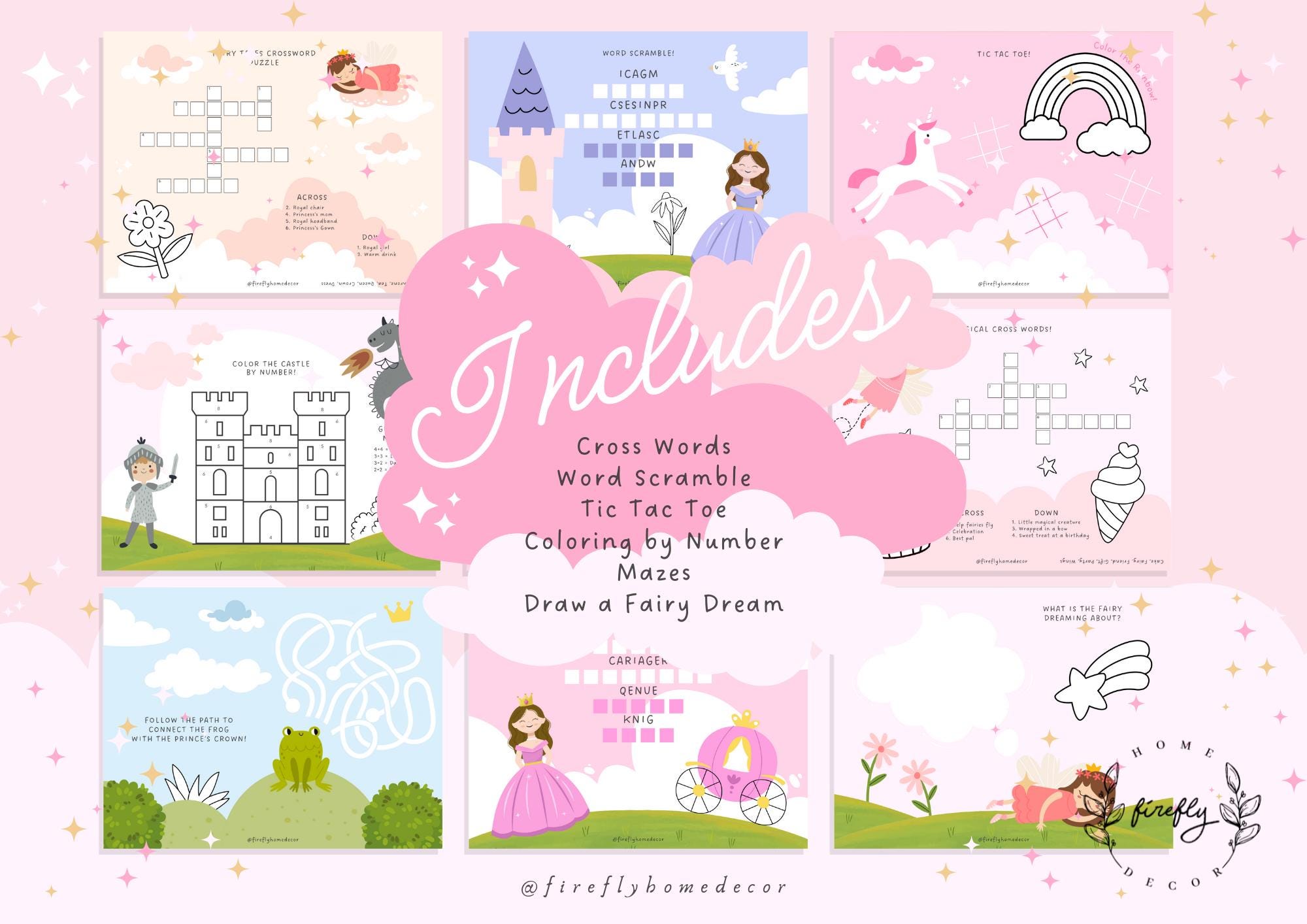Spot the differences, Finish the drawing, Mazes, Draw a royal Pennant, Words Scramble, Match the shapes, Connect the lines, Wordsearch, Cross words, Color by number, Tic tac toe, Coloring, What is the fairy dreaming, Complete the Pattern, Free coloring, Match the fruits, and more!